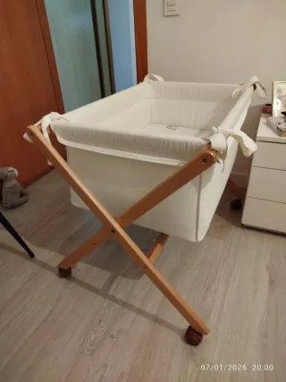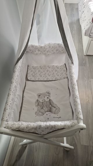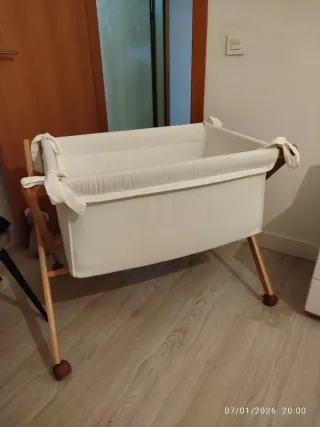Minicuna de madera de haya lacada. - Incluye colchón. - Textil Reversible completo: Edredón - Todo es de fácil lavado. - 4 ruedas con freno. - Cómoda para mover y descansar el bebé en su primera edad. Nuestra bebé la acaba de dejar de usarla. el producto está impecable. Precio origanal 85€