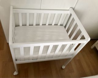 Minicuna blanca de madera con un diseño sencillo y funcional. Perfecta para tener al bebé cerca. Sé añade el colchón en perfecto estado. - Estructura de madera. - Ruedas para facilitar el desplazamiento.