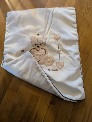 Edredón para minicuna, con un tierno diseño de osito y corazones. - Estampado de osito con corazón. - Detalles de corazones colgantes. - Ribete oscuro en los bordes.