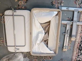 Cuna colecho para bebé, ideal para los primeros meses. Está en buen estado y es muy práctica. - Se pliega fácilmente para facilitar su transporte y almacenamiento. - Incluye un cómodo colchón. - Diseño ligero y moderno en color celeste. -Incluye funda de transporte Conservada en la caja original. Se ata a la cama para que quede a la altura y poder facilitar la lactancia y el colecho seguro.