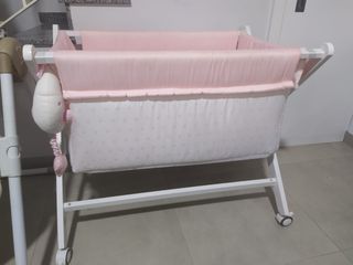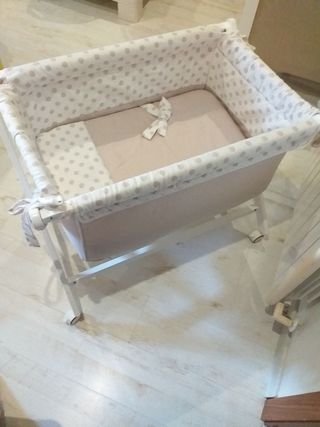 Minicuna colecho para bebé, usada solo un mes. Está en muy buen estado, prácticamente nueva, ni rotos, ni manchas. - Ideal para colecho. - Estructura de fácil montaje. - Tejido gris oscuro y blanco.