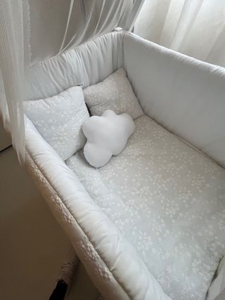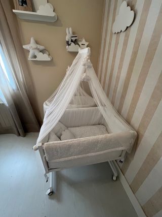 Preciosa minicuna de madera en color blanco con ruedas. Comprada en junio de 2024. Como nueva. Precio de compra 190 €.