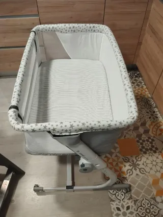 Uno de los frenos falla y uno de los lados está algo torcido como se aprecia en las fotos. El colchón tiene una mancha de leche muy leve, adjunto foto. Precio original 150€. La entrego desmontada si se quiere. - Estructura de metal efecto madera. - Tejido gris claro. - Incluye colchon duro, cinchas para hacer colecho y mosquitera. -Regulable en 7 alturas a ambos lados, para el reflujo genial. Regalo 1 edredón con el nórdico desenfundable, para así poder usarlo tanto en verano como en invierno, 4 sábanas bajeras, una de ellas de pelito para invierno y 2 protectores impermeables para el colchón. Entrego bolsa de transporte y caja