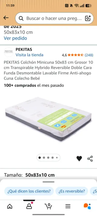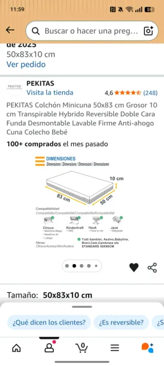 Colchón para minicuna de la marca Pekitas, con medidas de 50x83x10 cm. Es transpirable y reversible. - Funda desmontable y lavable. - Firme y anti-ahogo. - Ideal para cunas colecho. -Poco uso