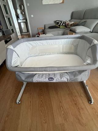 Minicuna Chicco Next 2 me de tela. Tiene 5 alturas y se puede regular de ambos lados independientemente. Se Vende con su colchon y un adaptador ya que las medidas son un poco raras. Tenemos tambien otros dos colchones, si estas interesado pregunta sin compromiso.