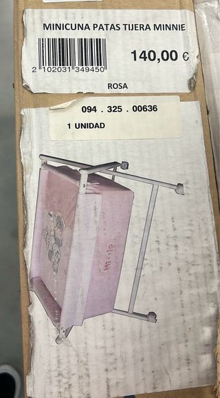 Minicuna plegable con diseño de Minnie Mouse sin uso prácticamente. - Estructura tipo tijera. - Color rosa. - Incluye 1 unidad. La caja no la tengo, subo la foto de la caja para que se vea lo que me costó. No incluye la cama nido que aparece en el interior gris.