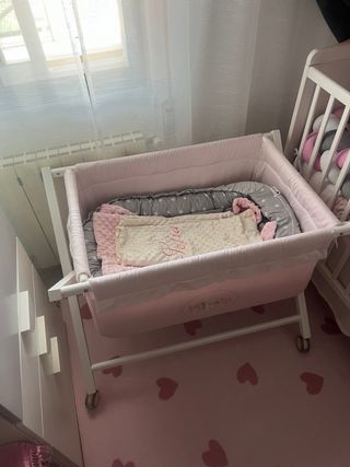 Minicuna colecho en perfecto estado, apenas usada. Es de color rosa y gris, y tiene ruedas para facilitar su movilidad. - Ideal para los primeros meses del bebé. - Estructura ligera y fácil de montar. - Tejido suave y transpirable.