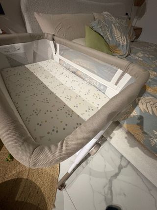 Minicuna de colecho de la marca Jane, babyside by Jane, ideal para los primeros meses del bebé. Está en buen estado y es perfecta para tener al bebé cerca durante la noche. - Diseño ligero y fácil de transportar. - Tejido suave y transpirable. - Incluye instrucciones de montaje. Regalamos las sabanas de la foto