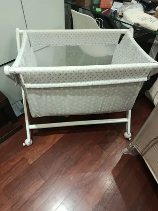 Minicuna de colecho en color gris, 3 posiciones en altura y abertura lateral. Incluye colchón, 3 protectores de colchón y 4 juegos de ropa de cuna. A recoger en Gijón, no se hacen envíos.