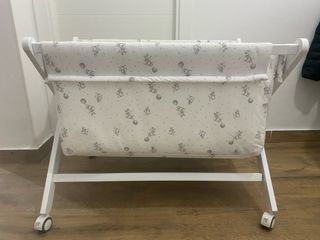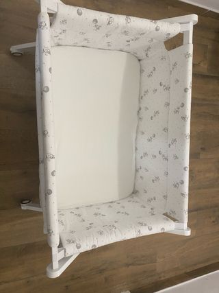 Minicuna de madera blanca, perfecta para los primeros meses del bebé. Se encuentra en muy buen estado. - Estructura de madera de color blanco. - Tejidos suaves en tonos beige con estampado de estrellas. - Incluye colchón y protector de colchón. - Ruedas para facilitar el movimiento, también con frenos. - Vestimenta fácil de quitar para lavar