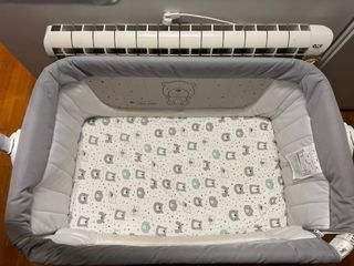 Minicuna en buen estado, ideal para los primeros meses del bebé. - Estructura blanca y gris. - Laterales de malla transpirable. - Colchón con estampado de estrellas. - Incluye sábana bajera y encimera (como la foto)
