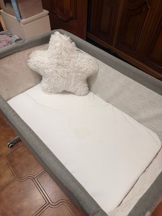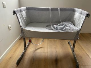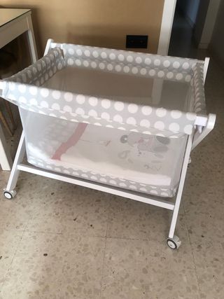 Minicuna TOTALMENTE nueva ,ni un sólo uso porque la bebé no quería , la tengo empaquetada por eso subo una foto de una similar, la mia es beige muy bonita. Dos posiciones una recta y otra antireflujo, balancín y para fija, cremallera colecho y mosquitera, es totalmente desenfundable para lavarlo todo, sábanas de minicuna tambien nuevas del corte inglés ,si quieres foto te la paso😊