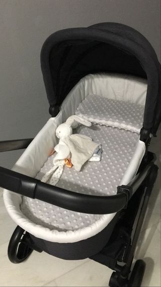 Preciosa minicuna para bebé, en color gris. Está en muy buen estado. - Ideal para los primeros meses del bebé. - Tejido suave y acolchado. - Malla transpirable en los laterales.