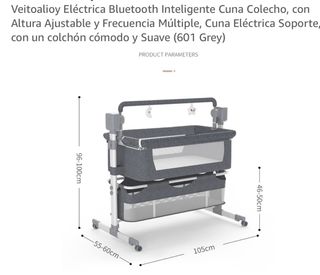 Minicuna eléctrica con un diseño moderno y funcional, ideal para el descanso del bebé. Cuenta con un dosel para crear un ambiente acogedor. - Estructura de metal resistente. - Laterales de malla transpirable. - Ruedas para facilitar el movimiento. - Cesta de almacenamiento inferior. colchón aparte comprado del corte inglés anti alérgico anti ácaros , nuevo sin uso