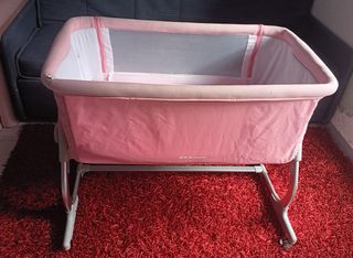 Minicuna de la marca Jane, ideal para los primeros meses del bebé. Su diseño permite colocarla junto a la cama de los padres. - Color rosa. - Estructura metálica. - Laterales de malla transpirable. Tiene signos minimos de desgaste poco uso pero al lavarse para su venta cambio un poco el Color como se ve en las fotos