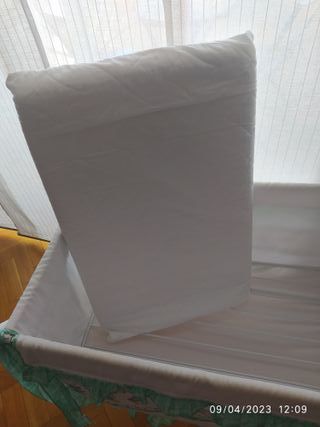 Minicuna + colchón Fácil de montar y desmontar. Es bastante amplia. La tela se puede lavar en la lavadora. El colchón tiene funda con cremallera. Las ruedas son nuevas.