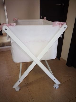 Se vende minicuna de madera con patas cruzadas y ruedas.Incluye colchón.