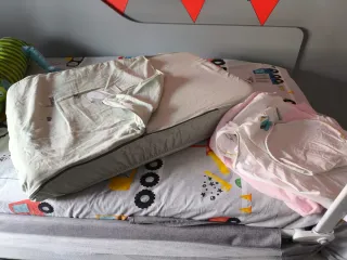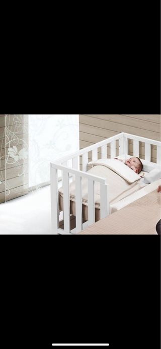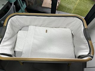 Preciosa minicuna de colecho, ideal para los primeros meses del bebé. Se encuentra en muy buen estado, ya que mi bebé es grande y la ha usado poco tiempo. - Incluye colchón. - Estructura beige en perfecto estado. - Fácil montaje y transporte gracias a sus ruedas. -Regalo varias bajeras, la bajera plástica, el edredón y la funda original de Jane de estrellaa. Tiene un pequeño desperfecto que se ve en la foto, pero con la madera superior ni se nota, ni va a más, mi bebe ha sido grande y no ha tenido problema.