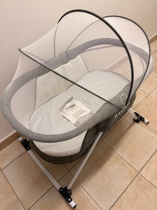 Minicuna plegable en perfecto estado, prácticamente sin uso. Ideal para los primeros meses del bebé. - Estructura plegable para fácil almacenamiento. - Diseño moderno y seguro. - Tejido transpirable. - Con mosquitera retráctil