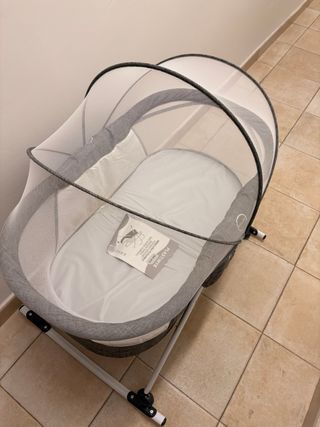 Estructura para minicuna. - Color gris y blanco. - Base plegable con ruedas. Las vestiduras están un poco desgastadas y una cremallera no funciona del todo bien.