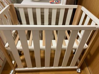 Minicuna colecho con 4 ruedas y estructura de madera Blanco-Natural. Incluye Somier y Colchón impecable. Diseño moderno y funcional. Sin apenas uso. Dispone del Kit - Colecho Completo y en perfecto estado (sin estrenar).