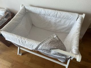 Mini cuna bebe de madera, color blanco lacado con ruedas y freno. Faldones desmontables, colchon y edredon incluido.