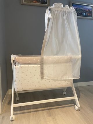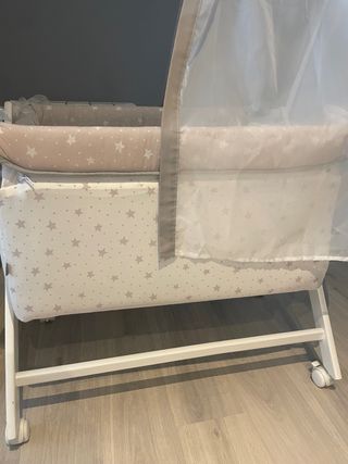 Minicuna Chicco next2me dreams. Tiene modo balancin y modo estable. Se puede ajustar en 11 alturas diferentes. Se puede ajustar una parte más alta que otra para que quede la cabeza más alta en caso de reflujo. Tiene una red en cada lateral que además de visión da ventilación a la cuna y uno de los laterales se puede bajar muy cómodamente( con solo un botón. Incluye un colchón transpirable y muy firme que garantiza la correcta postura del bebé durante el sueño, y evita su hundimiento, como recomiendan los neonatólogos. Viene con funda para transportarla facilmente. Se desmonta muy fácil y es lavable. De regalo: dos bajeras impermeables protectoras de colchón. dos juegos (lunares y plumas) con bajera y encimera y funda de almohada. dos bajeras extra. un nórdico y su funda (la de dibujitos).