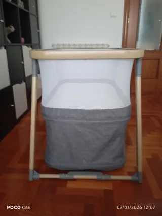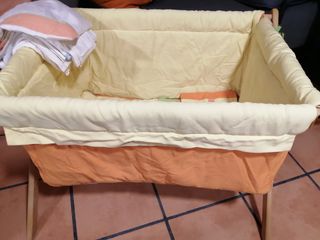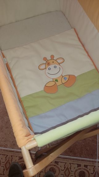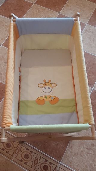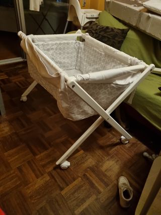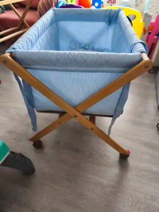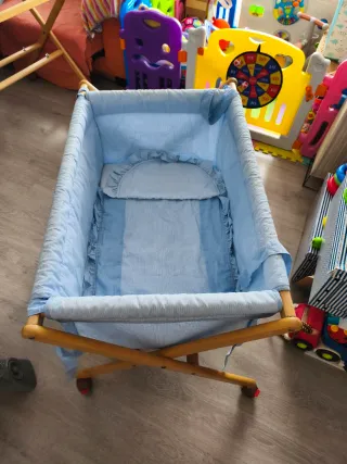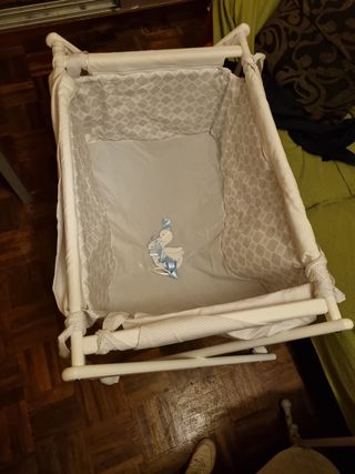 Preciosa minicuna de madera, perfecta para los primeros meses de tu bebé. Tiene ruedas para facilitar su movilidad y sistema de anclaje. Se encuentra en buen estado. - Estructura de madera. - Incluye ruedas. - Sistema de anclaje.