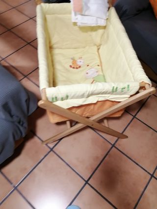 Preciosa minicuna de madera para bebé, en tonos amarillos y verdes. Está en buen estado y es perfecta para los primeros meses del bebé. - Estructura de madera. - Tejidos en amarillo y verde. - Incluye colchón.