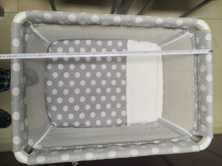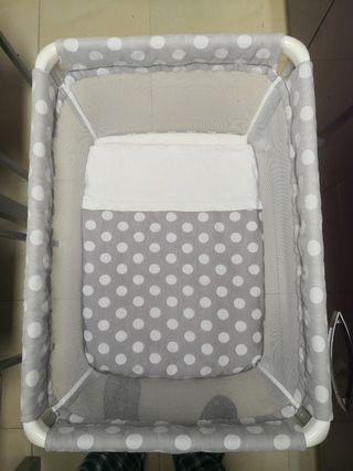 Minicuna con estructura de madera blanca y lateral de tela. - Ruedas nuevas para facilitar el movimiento. - Tela en color beige con estampado de lunares blancos. - Incluye colchón aloe vera y protector de colchón impermeable. Medidas del colchón: 78x48cm Altura de la cuna: 75cm de las ruedas al borde.