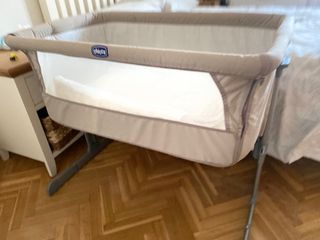 Minicuna colecho Chicco Next2me en color gris. Solo en mano, puedo acercarla si es necesario, zona de Valladolid y alrededores. - Laterales acolchados. - Colchón incluido. - Estructura metálica. - Elevable a distintas alturas - Se puede mecer al niño (de forma manual) En perfecto estado, salvo alguna mancha en la redecilla de la puerta. Tiene poco uso, porque no quiere dormir en ella.... Se entregaría montada, con todos los accesorios, las correas para el colecho, y el colchón que trae. Lasinstruciones, e cso ncesario se pueden conseuir en internet Posibilidad de añadir otro colchón para elevarlo un poco, y ropa (protectores, s