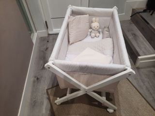 Minicuna de tijera de madera blanca, con colchon y vestidura a juego. Por la compra regalo una bolsa de ropa de lo que voy retirando