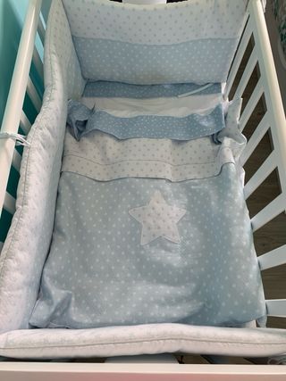 Preciosa minicuna de la marca Interbaby, en perfecto estado. Ideal para los primeros meses de tu bebé. - Diseño con estrellas, muy elegante y moderno. - Estructura ligera y fácil de montar. - Incluye colchón a juego y funda nórdica - Se puede autonivelar para mayor seguridad del bebé en cuanto a cólicos y vómitos. -Tiene ruedas y es fácilmente transportable entre habitaciones para poder llevar por ejemplo del dormitorio al salón o similar... Tamaño: medidas exteriores: largo 85cm , ancho 55cm, altura 90cm. Anchura entre patas: 59cm y extendida 69cm.