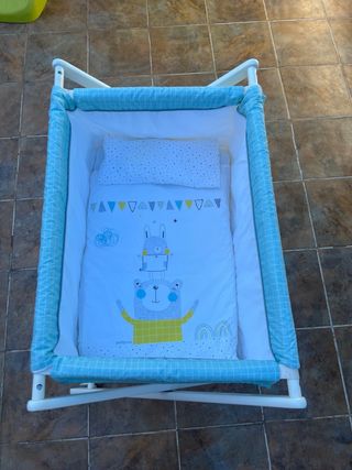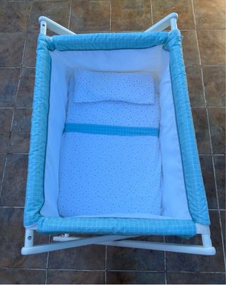 Preciosa minicuna de madera en buen estado. Ideal para los primeros meses del bebé. Lleva algún roce en la madera pero es estético, funciona a la perfección. - Estructura de madera de color natural. - Tejidos suaves en tonos azules y blancos. - Incluye colchón, sábana bajera y colcha ideal para los meses más frios