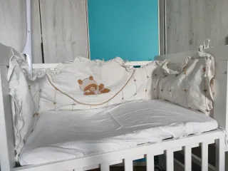 Protector acolchado para minicuna con un tierno diseño de osito. - Tejido blanco con detalles bordados. - Volantes en los bordes. - Estampado de osito en el centro. Le falta un lacito para atarlo a la minicuna, pero no hay ningún problema para sujetarlo, como se puede ver en la foto.
