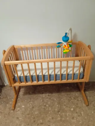 Minicuna de madera con un diseño clásico y funcional. Incluye colchón (recién pasada la vaporeta). Se puede mecer o dejarla fija. Yo la he utilizado para tenerla en el salón para las siestas. Regalo movil de cuna. - Estructura de madera clara. - Laterales con barrotes. - Colchón incluido. Medidas: Largo-95 Ancho-50 Alto-85 Hay que venirla a buscar. No pesa mucho