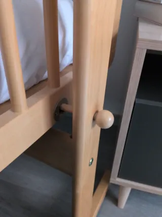 Minicuna de tijera con estructura de madera. - Diseño plegable. - Ruedas para facilitar el movimiento. - incluye protector de colchón de rizo, 2 sábanas bajeras, sabana encimera y funda de almohada aunq la almohada no se usó - tiene colchón de 4 cm que se ve en las fotos - en la parte de abajo del colchón tiene un enganchón como se ve en las fotos pero que una vez montada no se ve ni afecta a su uso