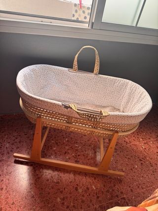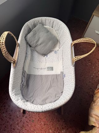 Moisés Cambrass en perfecto estado, ideal para los primeros meses del bebé. Incluye cesta y cojín. - Cesta de mimbre. - Interior acolchado con estampado de estrellas. - Cojín gris de tejido waffle.