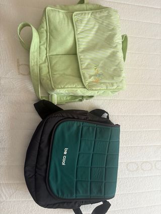 Bolso para bebé o para colgar en el carro. - Bolso superior de color verde claro con rayas blancas y bordado. - Bolso inferior de color negro y verde oscuro con el texto be cool.