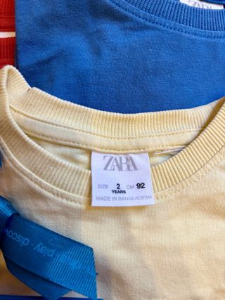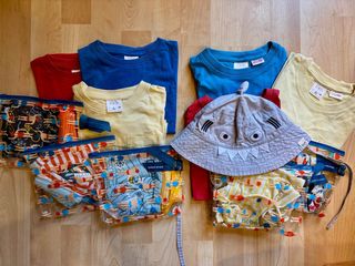 Conjunto de ropa de verano para niños, ideal para edades de 2 y 3 años. Incluye varias prendas y accesorios. - 6 camisetas de ZARA de manga corta en colores azul, amarillo y rojo. - Un sombrero de pescador con diseño de tiburón. - 6 bañadores de la marca BOBOLI en su funda original.