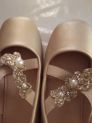 Preciosos zapatitos para niña en color dorado, muy cómodos y con un bonito detalle. - Talla 31. - Color dorado. - Adorno de mariposa con perlas y pedrería.