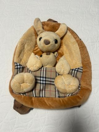 Adorable mochila de peluche con diseño de canguro y su cría. Perfecta para los más pequeños. - Material suave y tierno. - Diseño de canguro con bebé. - Bolsillo frontal con estampado a cuadros.