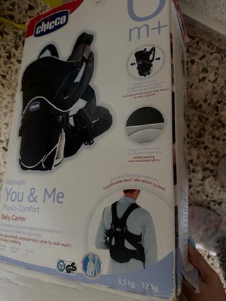 Mochila porta bebé Chicco modelo You & Me Physio-Comfort. - Diseñada ergonómicamente para el bienestar de mamá y bebé. - Sistema de ajuste dual que se adapta al crecimiento del bebé. - Doble acolchado con tejidos transpirables. - Sistema Schiena comoda para alivio de la espalda. La caja esta rota pero la mochila esta perfecta