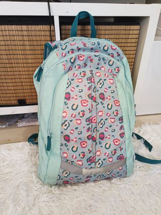 Mochila escolar con un divertido estampado. - Color turquesa. - Estampado de manchas en tonos rosas, naranjas y grises. - Asa superior. - Varios compartimentos y bolsillos con cremallera. - Tiras ajustables. - Espalda y asas/tirantes acolchados - Protector para la lluvia (amarillo anaranjado) - De gran tamaño y capacidad - Cinturón para sujetar a la cintura - 45x30cm aprox - 22 litros aprox. - Muy ligera