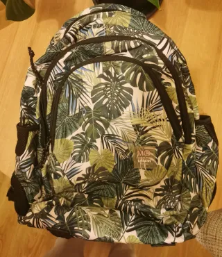 Mochila con un llamativo diseño de hojas tropicales en tonos verdes y blancos. Ideal para el día a día o para la escuela. - 3 compartimentos con bolsillos en cada uno de ellos - Cargador de movil - Bolsillos laterales de malla. - Refuerzo en la espalda y en las asas