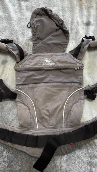 Mochila portabebés de la marca Manduca, en color gris y beige. Diseñada para llevar al bebé de forma cómoda y ergonómica. - Tejido resistente y suave. - Cierre de cremallera. - Capucha ajustable. - Cinturón lumbar acolchado. solo usada muy poco pero poco