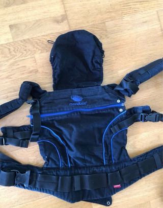 Mochila portabebés Manduca en color negro con detalles en azul. Se vende mochila porta bebés MANDUCA. Como nueva. Apta desde 3,5kg hasta 20kg, con reductor incluido. Ergonómica. Recomendada por pediatras, matronas y fisios pediátricos. Color negro y azulón. Unisex. Muy cómoda. - Capucha integrada. - Cinturón lumbar ajustable. - Tirantes acolchados.