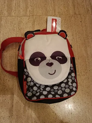 Mochila de Fisher Price de tres usos (la cinta permite usarse como fiambrera, bandolera y mochila). En forma de oso panda. Bolsillo delantero. Tamaño 21 x 7,5 x 28cm. Es de poliéster. El forro de material aislante mantiene la temperatura de comida y bebida.