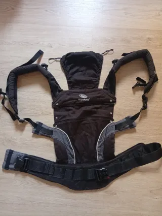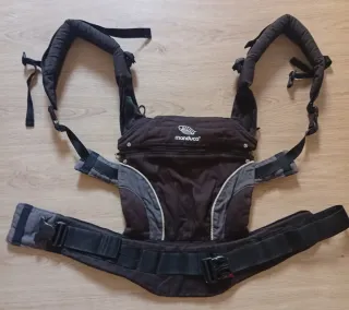 Mochila portabebés Manduca. Muy útil y cómoda, sobretodo por el hecho de poder utilizarla con los tirantes cruzados, se nota menos el peso del bebé. Viene con la caja y las instrucciones. Tiene alguna pequeña mancha, pero se nota muy poco y no afecta al uso.