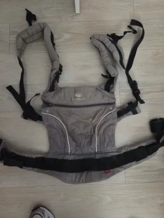 Mochila portabebés de la marca Manduca. Es cómoda y ergonómica para llevar al bebé. - Color beige y gris. - Tirantes acolchados. - Cinturón lumbar ajustable.